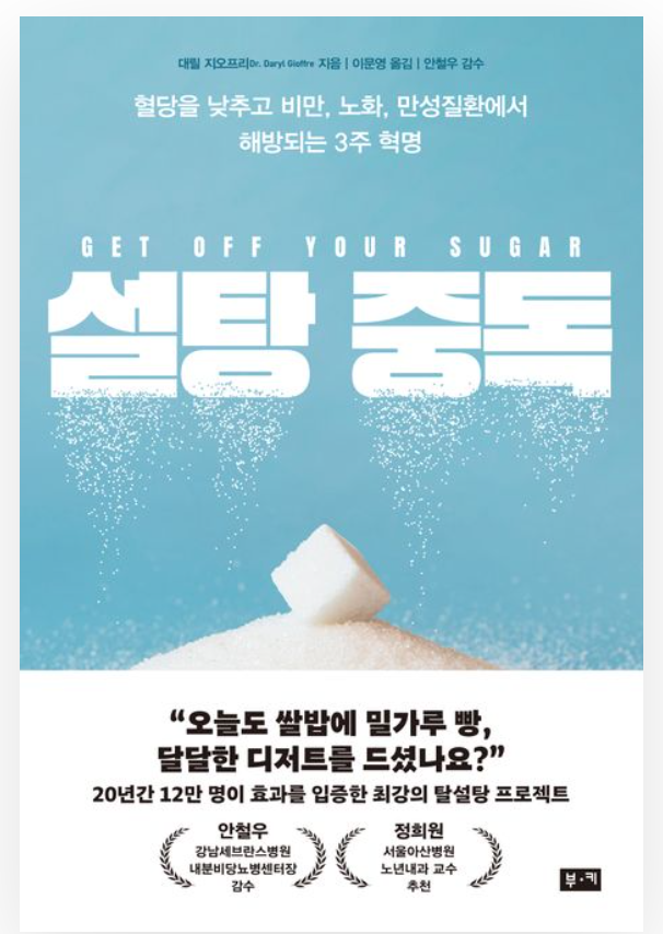 1. 시작하는 글요즘 들어 건강에 관심이 많아진 나는 회사 도서관에 '설탕 중독'이라는 책을 대기를 걸어두었고, 3달여가 지나서 해당 책을 받게 되었다.저속 노화, 건강은 MZ세대도 관심이 많고 많은 사람들이 건강하게 살기를 바란다.이 책은 표지에도 나와 있지만, 혈당을 낮추고 비만, 노화, 만성질환에서 해방되는 3주혁명을 통해 인생을 바꾸는 책이다.표지 하단에도 있지만 요즘 유퀴즈 등 유튜브, 각종 방송 매체에서 출현하시는 서울아산병원 노년내과 교수님인 정희원 교수님이 추천하는 책이다. - 책 Detail저자 : 대릴 지오프리 (글, 미국 영양학자) - 번역 : 이문영 , 감수 : 안철우 (세브란스 내분비당뇨병센터장)발행일 : 2024년 6월 28일출판사 : 부키 2.기억에 남는 내용1) 설탕의 진실-..
