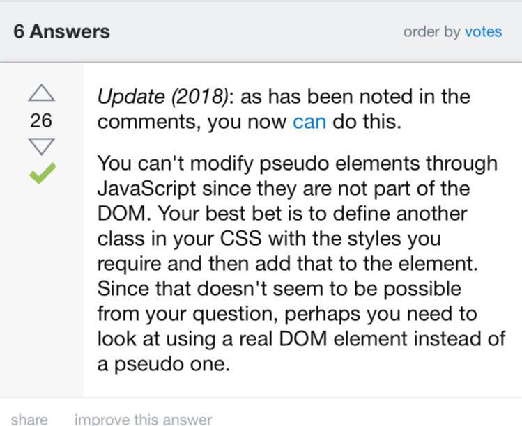 Pseudo 요소는 Javascript DOM요소가 아니니 접근이 불가능하다. 그러나, 방법은 있다!