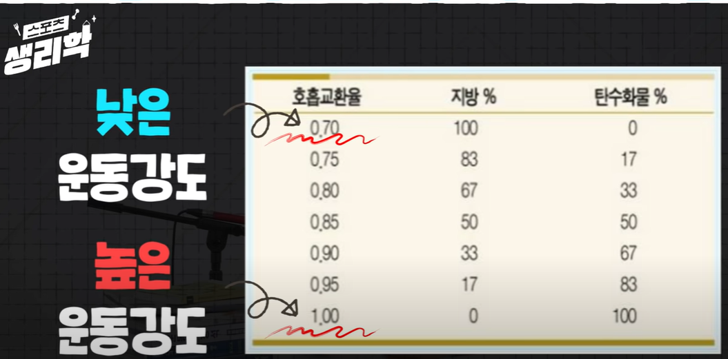 아래표에서 보듯이 저강도 운동을 해야 지방 연수가 잘된다고 한다. 흥미롭게도 탄수화물 연소율하고 지방의 연소율은 반대이다.