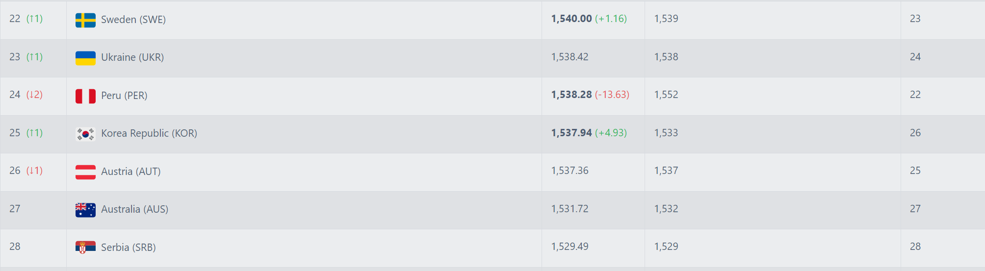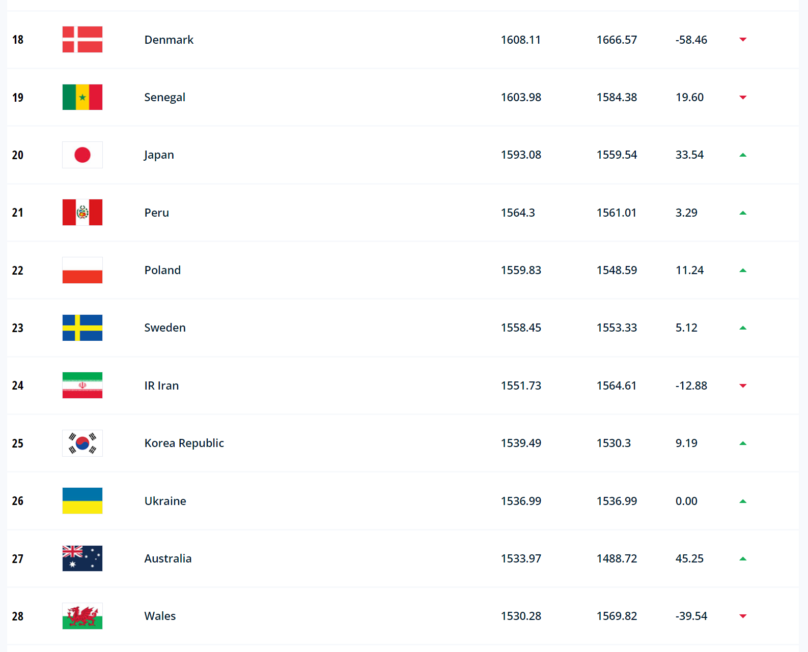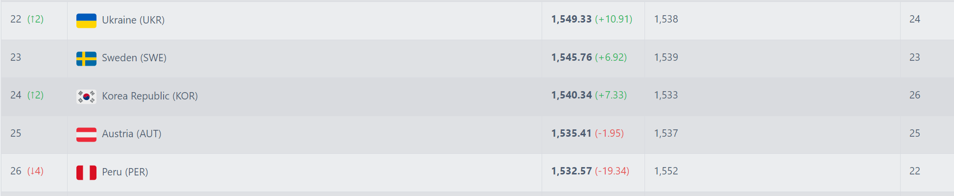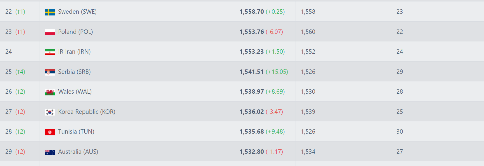 결국 최종적으로 3.47포인트를 잃으며 27위로 떨어졌다. 아래는 3월 29일 현재 실시간 피파랭킹이다.