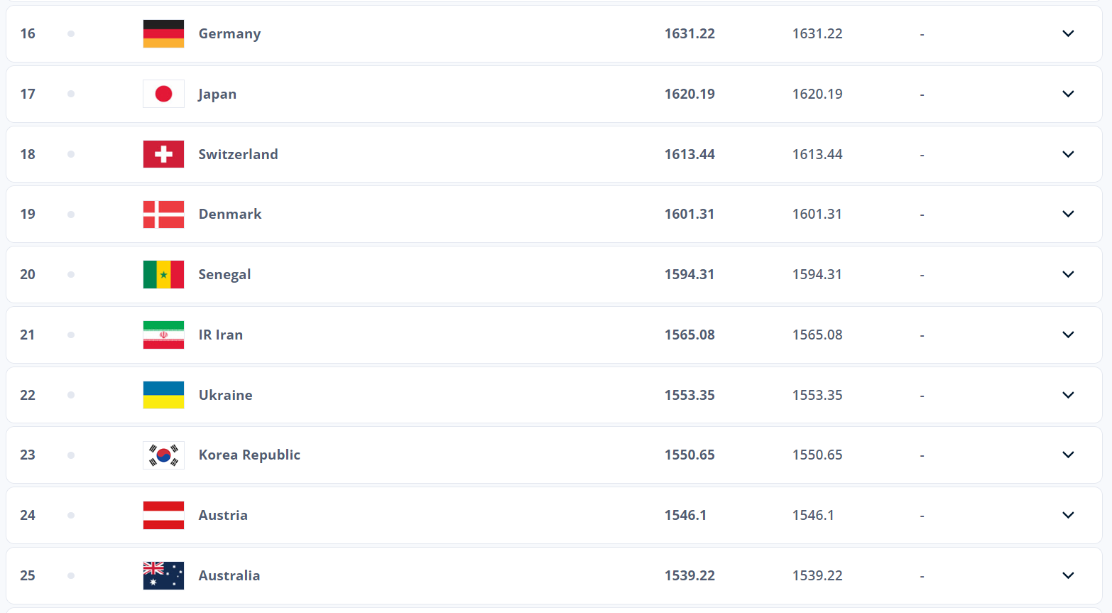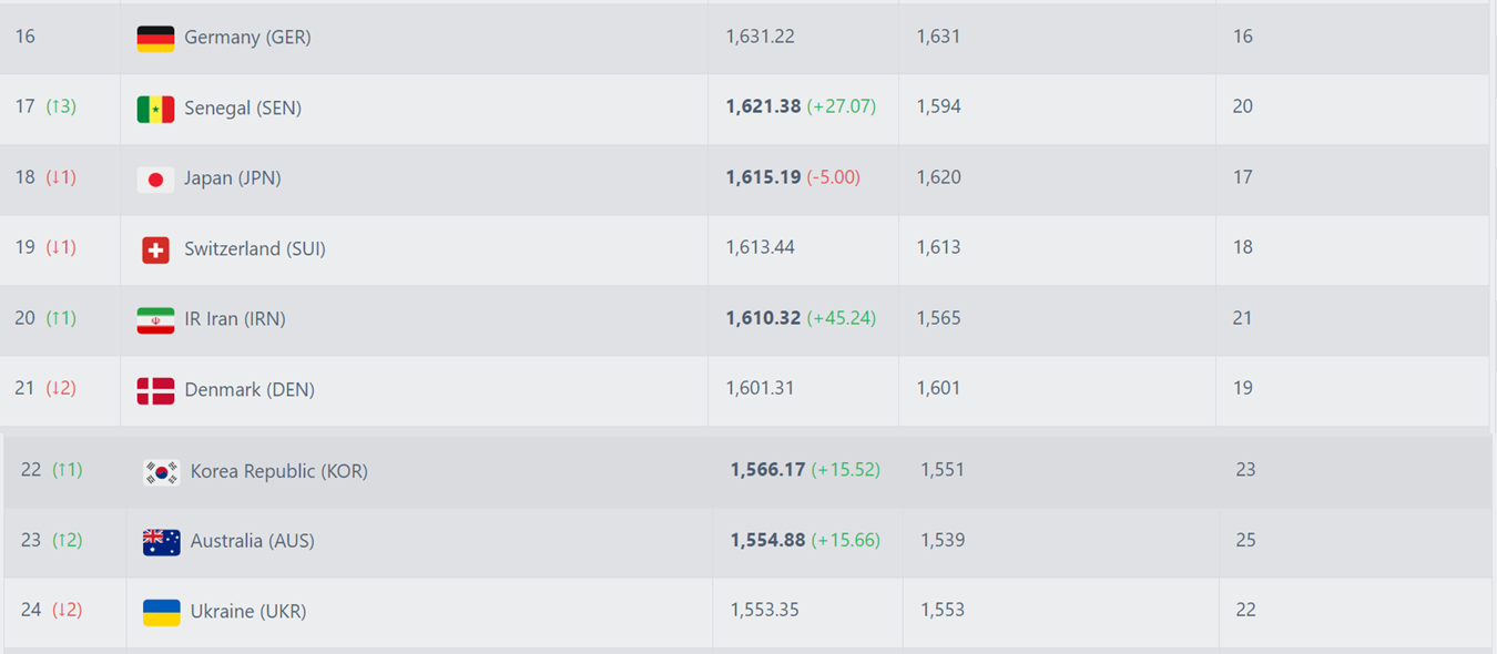공식 피파랭킹은 23위지만 실시간 피파랭킹은 22위에 위치하고 있다.