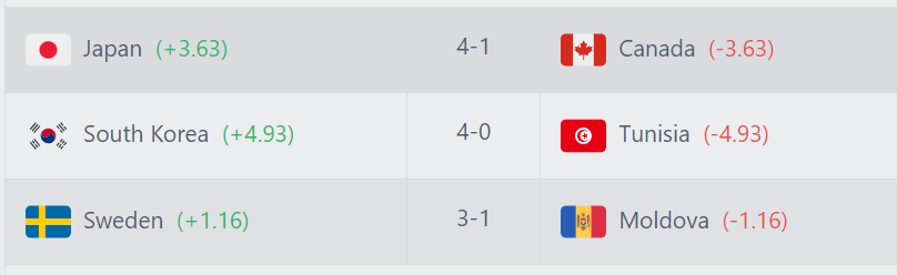 일본은 캐나다를 이기며 3.63 포인트를 얻었지만, 대한민국은 같은날 튀니지를 이기면서 4.93 포인트를 얻었다.