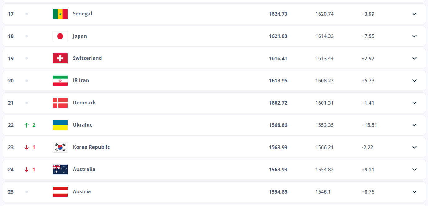 현재, 대한민국의 피파랭킹은 24년 5월 발표 기준 23위이고 전달보다 한계단 내려가 있는 상태이다. 일본은 18위, 이란은 20위, 그리고 호주는 24위에 위치하고 있다.