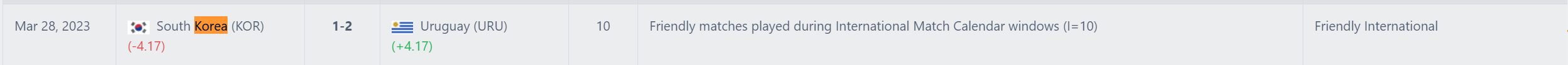 피파랭킹 16위 우르과이에 패하며, 4.17 포인트를 잃었다.