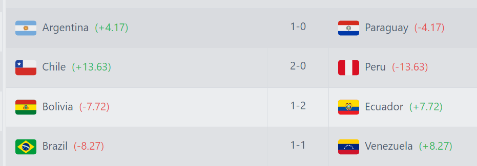 참고로 브라질 같은 경우는 피파랭킹1위지만 에콰도르는 41위인데, 두 팀은 비겼고, 브라질은 큰 점수를 잃고 베네수엘라는 큰 점수를 얻었다.