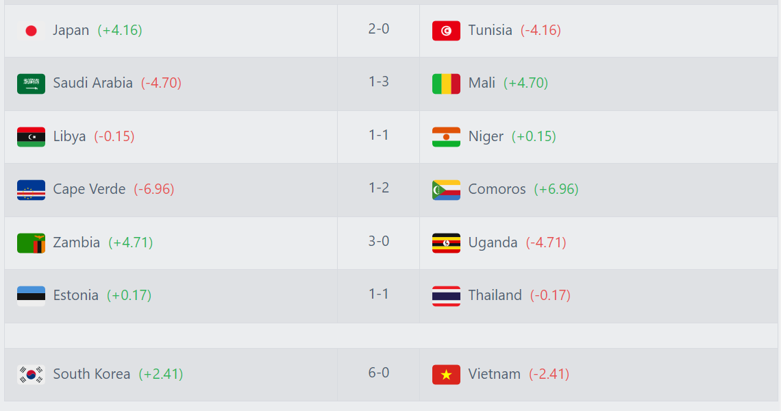 베트남전에서 6-0 대승을 거뒀고 2.41 포인트를 얻었다. 10월 베트남 피파랭킹이 95위지만 승리해서 대한민국은 아래와 같이 포인트를 얻었다. 일본 역시 튀니지전에 승리하였고, 다음달 피파랭킹은 18위로 예상되고 있다.