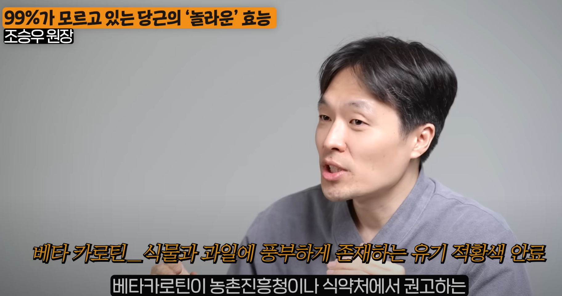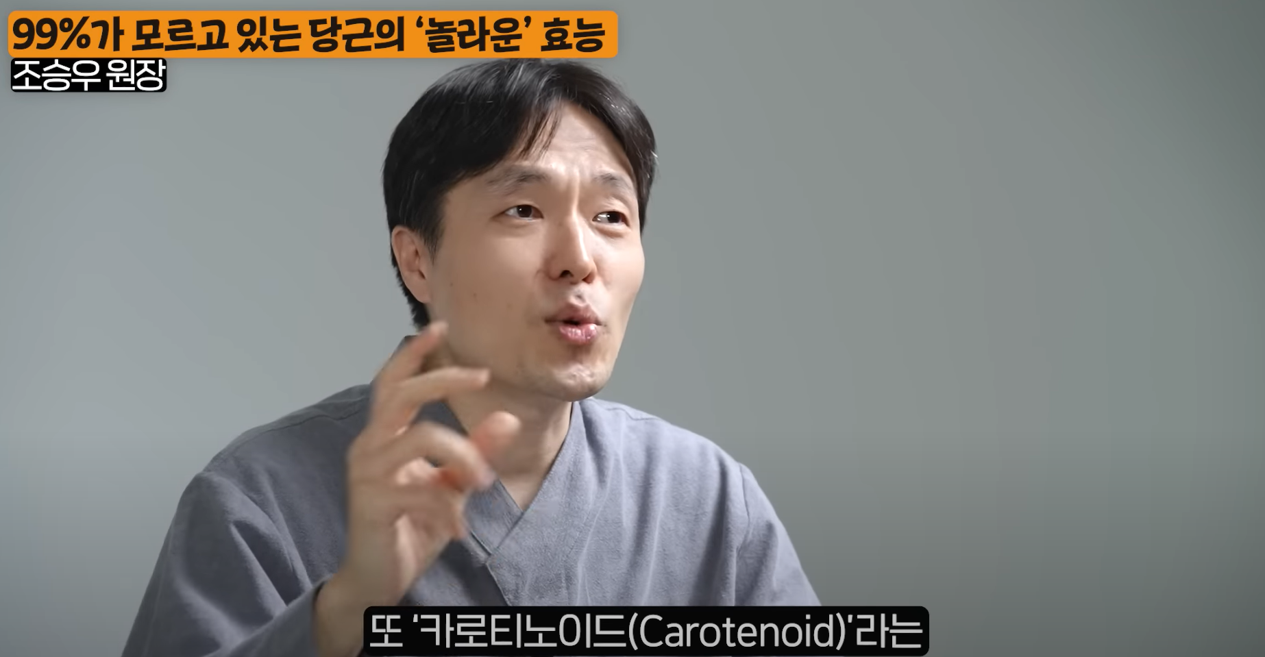 당근은 노화에도 좋고 변비에도 좋고 피부도 좋게 하고, 각종 심혈관 질환 고혈압, 당뇨 등 몸 곳곳에 좋다고 한다. 천연 영양소라고도 이야기했다.
