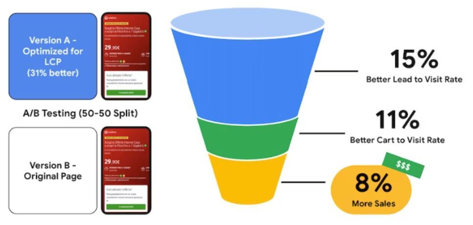 전세계 2위 이동 통신사인 Vodafone은 2021년 웹 성능 개선 건에 대한 A/B 테스트를 통해 웹 성능 지표 중 하나인 LCP(Largest Contentful Paint,