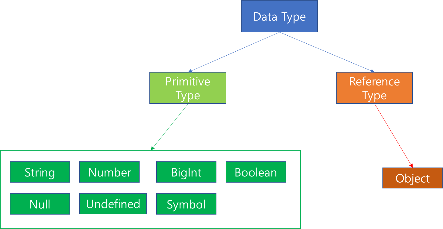 1. 데이터타입 Javascript의 Data Type(데이터타입)은 Primitive Type(기본형)과 Reference Type(참조형)으로 구분됨 1) Primititye Type : string, number, bigint, boolean, null, undefined, symbol(es6에 추가)로 구분 * null, undefined를 제외한 모든 기본값에는 기본값을 둘러싸는 객체가 있음 * symbol은 es6에서 추가된 변경 불가능한 primitive 타입으로 이름 충돌 위험이 없는 유일한 값. 객체 property key를 만들기 위해 사용됨 2) Reference Type : Obejct 로 하위 에 Array, Function, RegExp, Set / WeakSet(es6에 추가)..